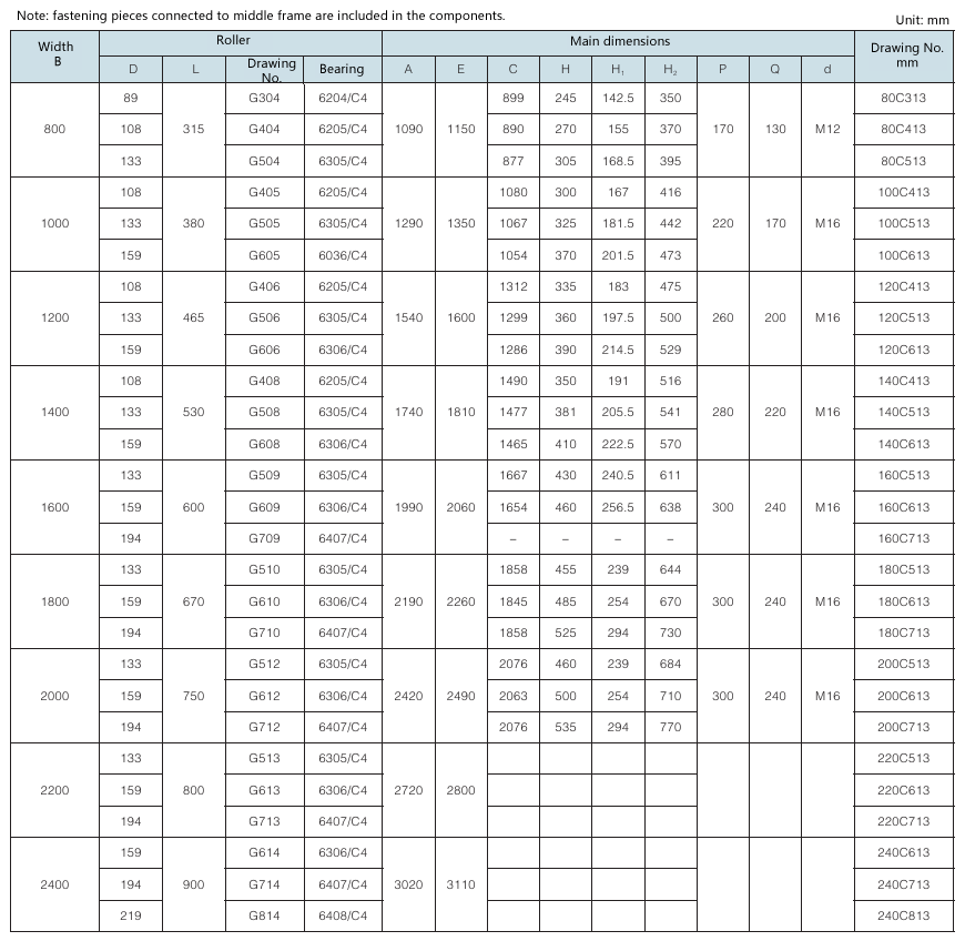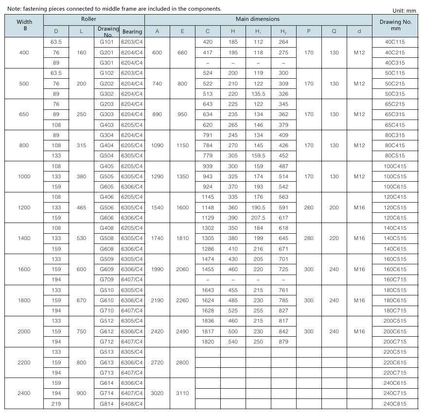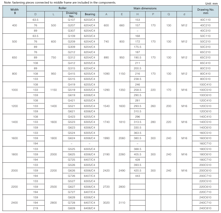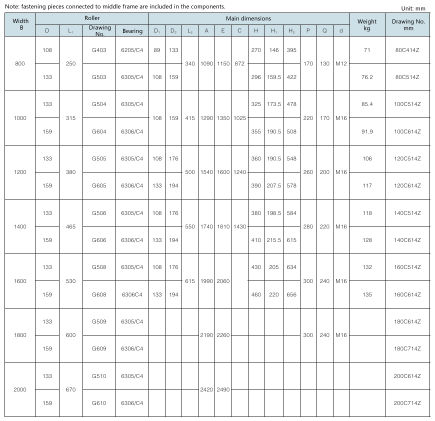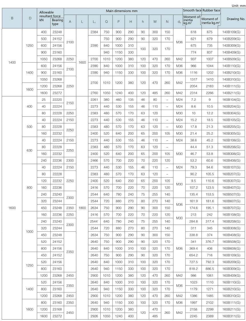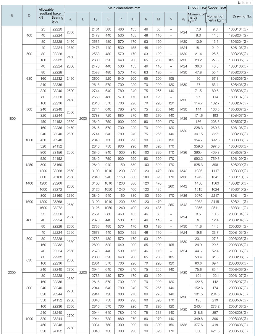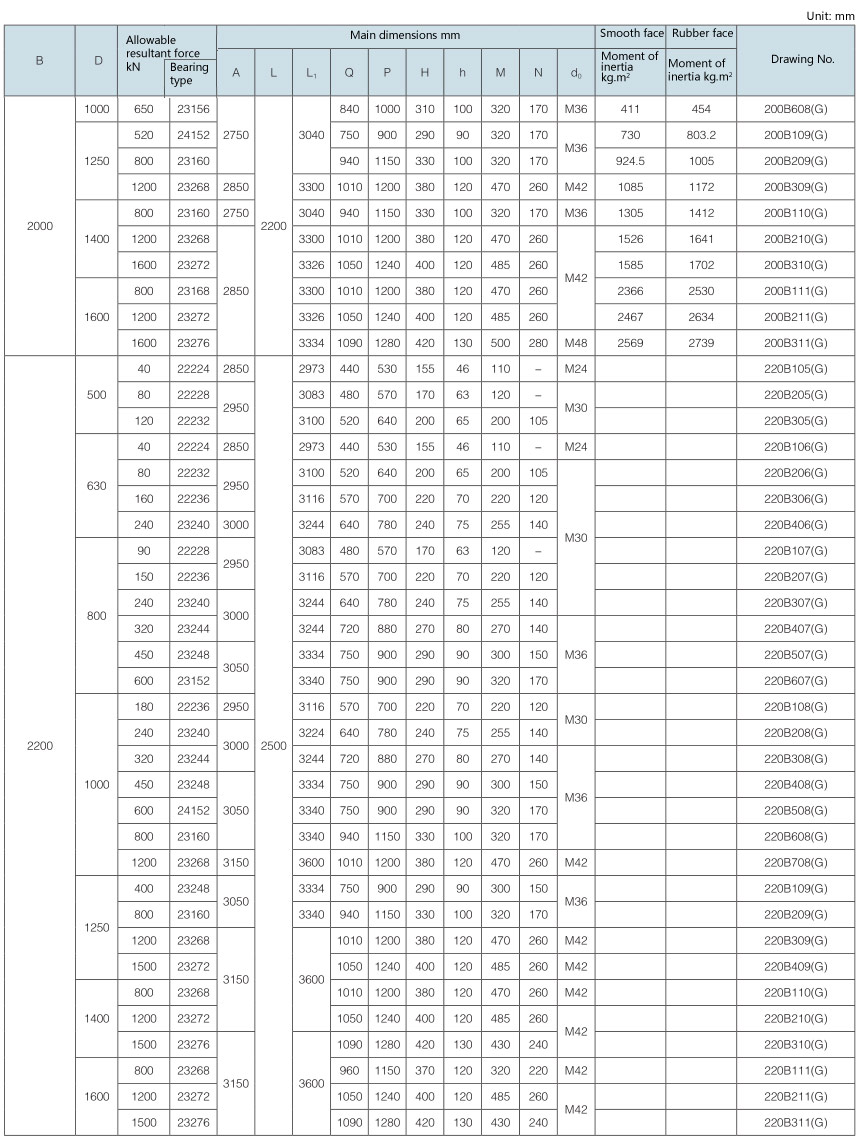 Requirement for drum surface: all are cast rubber surface. Drawing No. with “Y” as postfix refers to right-direction herringbone, with “Z” as postfix refers to left-direction herringbone, with “YZ” as postfix refers to diamond shape (omissible).